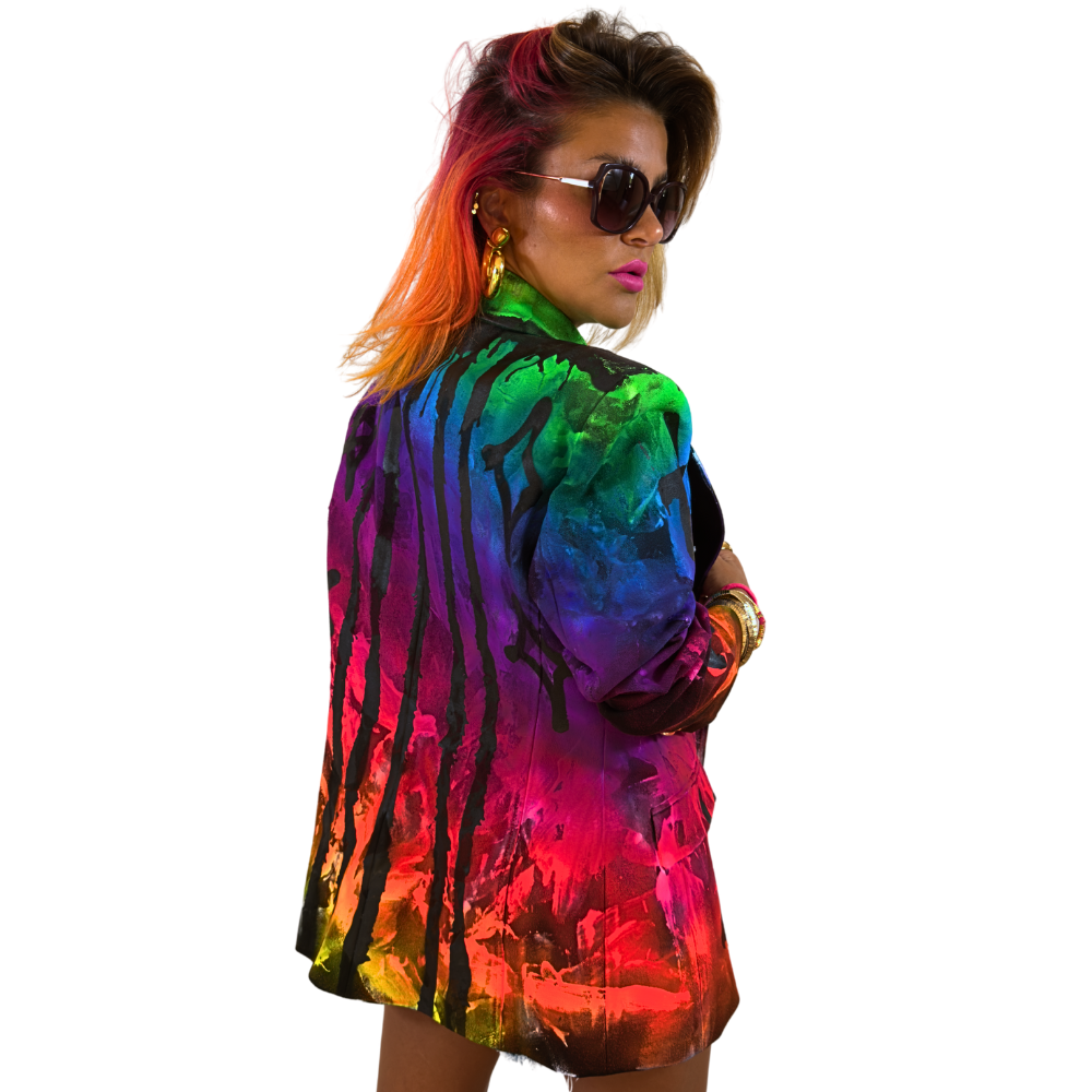 O Blazer Arco-íros é uma peça exclusiva de moda streetwear, criada para quem busca autenticidade e estilo urbano. Produzida em tecido resistente e pintada à mão com técnicas de grafite, cada unidade apresenta detalhes únicos, tornando cada peça diferente das demais.